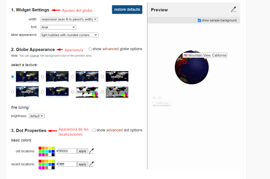 - Widget Settings (ajustes del contador): personalizar las dimensiones en píxeles (width), el tipo de fuente (font) y la apariencia de las etiquetas (label appearance).