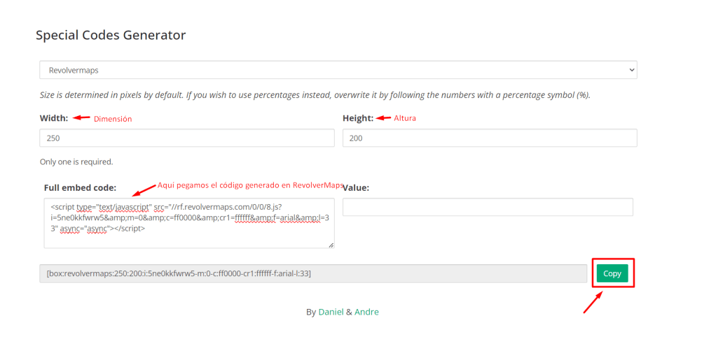 Tenemos que hacer clic en «Select special code…» y se desplegará un menú de opciones, hay que seleccionar la opción de «Revolvermaps» y a continuación se despliegan las opciones de elegir las dimensiones (width) y la altura (height) para que el contador aparezca en nuestra sala de chat. Las dimensiones están determinadas en píxeles. Luego en el apartado “Full embed code” pegamos el código que generamos anteriormente en la página de Revolver Maps de nuestro contador.