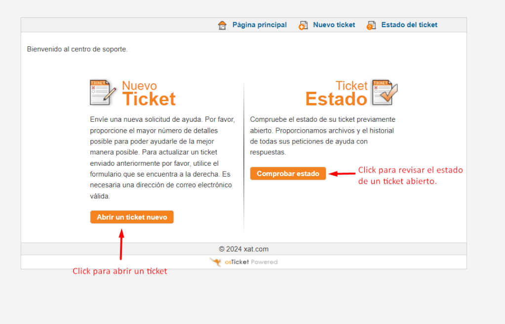 Visita la página: https://util.xat.com/support/index.php y haz clic en «Abrir un ticket nuevo«.