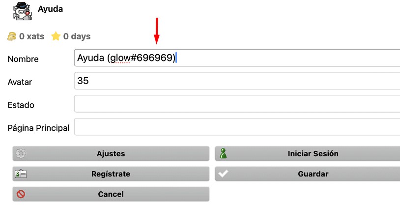 ⦁ Volveremos al paso 1 (personalización de nuestro perfil/usuario). Y añadiremos después del texto el siguiente comando: (glow#elcódigodecolor). Usando en “elcódigodecolor” nuestro código de la tabla anterior.