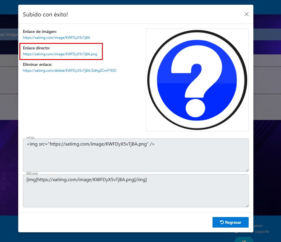 3) Cuando hayas subido la imagen, copia el link directo. Tendrá un aspecto como este: https://xatimg.com/image/KWFDyX5vTjBA.png, si el link directo no tiene .png al final, solo se lo agregas.
