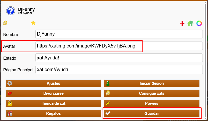 4) Da click a tu nombre en el chat y se te abrirá tu perfil, ahí busca la casilla «Avatar» y pega el link directo de la imagen (asegúrate que termine en .png).